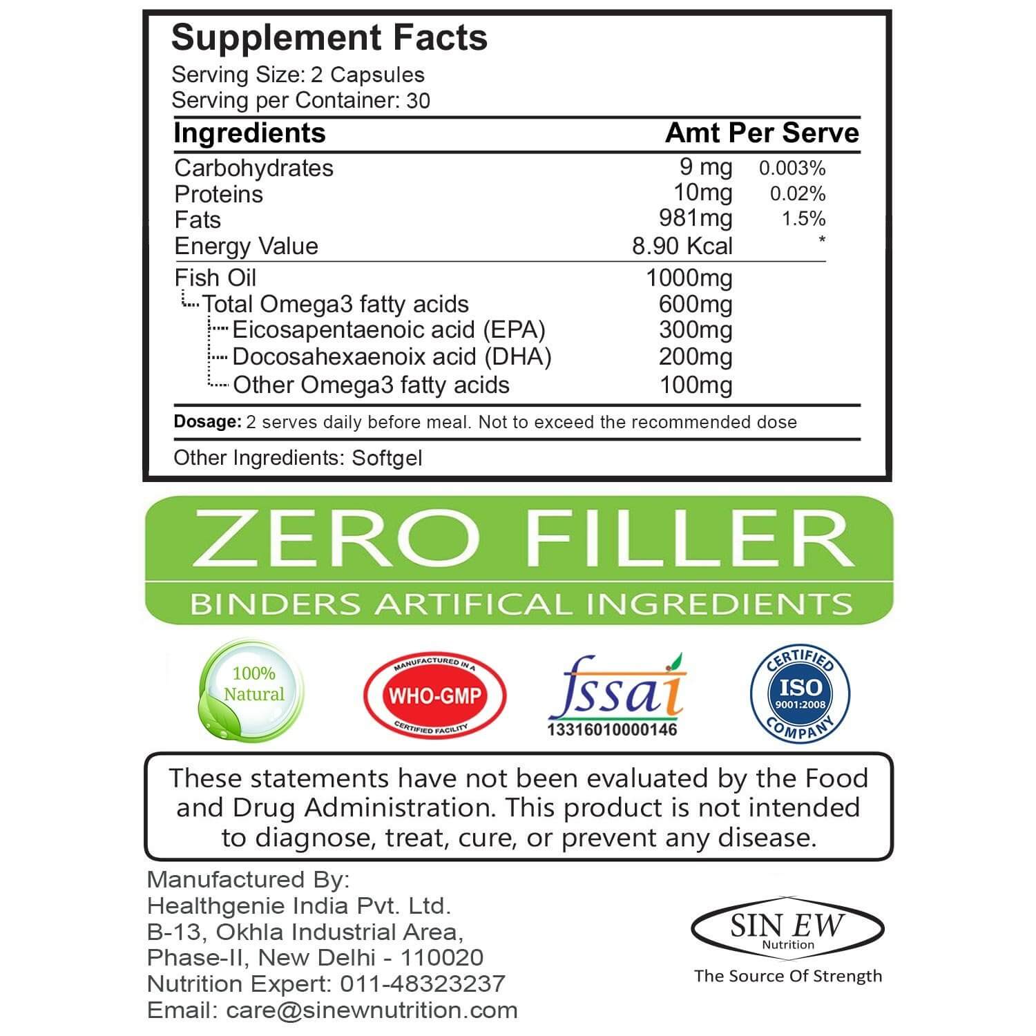 Sinew Omega 3 Fish Oil 500 mg (150 EPA & 100 DHA), 60 Soft-gels